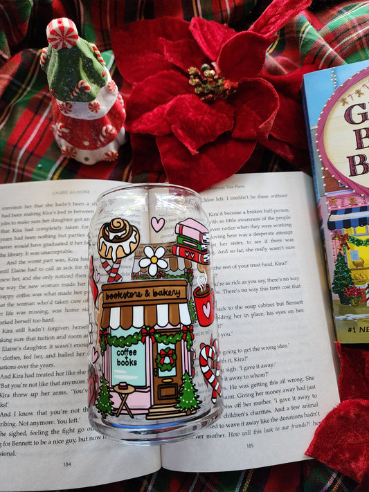 Gingy Bookstore 16oz glass can| Winter| Christmas| Cute Glass Can|Glass Tumbler w/Straw & Lid|