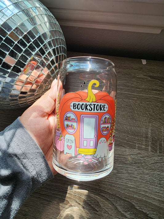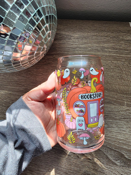 Pumpkin Bookstore 16oz glass can| Autumn| Fall Bookish| Pumpkins Books| Cute Glass Can|Glass Tumbler w/Straw & Lid|
