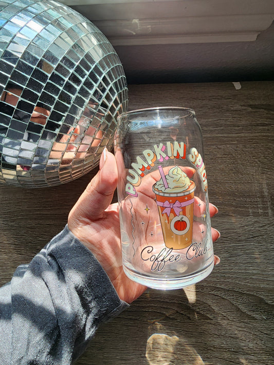 Pumpkin Spice Coffee Club 16oz glass can| Autumn| Fall Bookish| Pumpkins Books| Cute Glass Can|Glass Tumbler w/Straw & Lid|