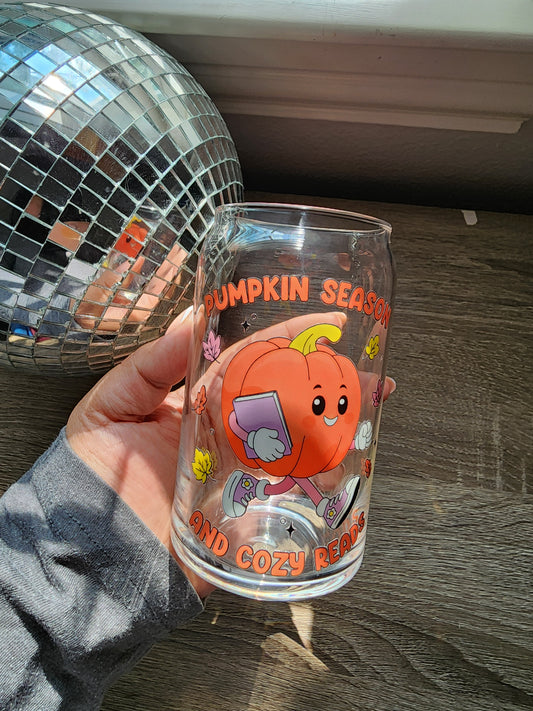 Pumpkin Season and Cozy Reads 16oz glass can| Autumn| Fall Bookish| Pumpkins Books| Cute Glass Can|Glass Tumbler w/Straw & Lid|