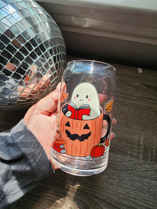 Fall Ghostie Pumpkin 16oz glass can| Autumn Ghostie Pumpkin| Bookish| Cute Glass Can|Glass Tumbler w/Straw & Lid|