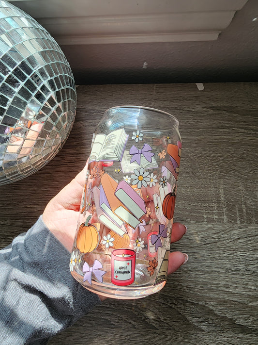 Autumn Bookish Girly 16oz glass can| Autumn| Fall Bookish| Pumpkins Books| Cute Glass Can|Glass Tumbler w/Straw & Lid|