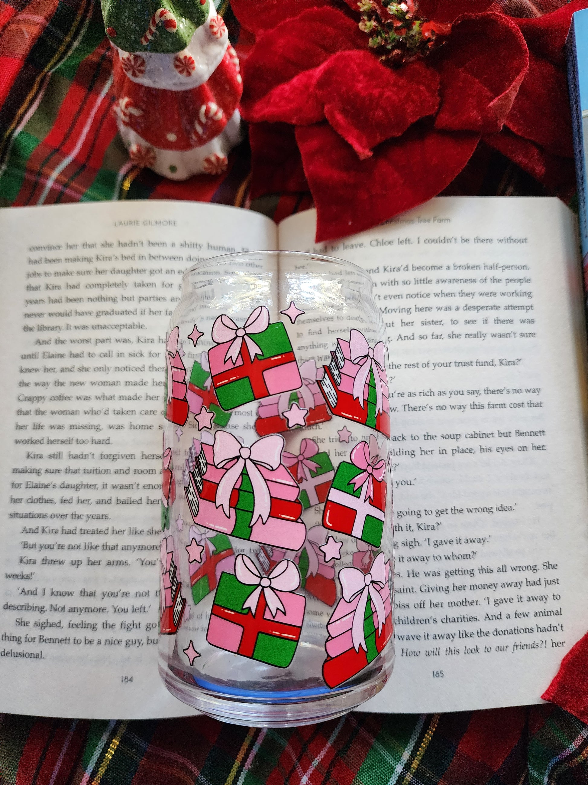 Book stack Christmas 16oz glass can| Winter| Christmas| Cute Glass Can|Glass Tumbler w/Straw & Lid|