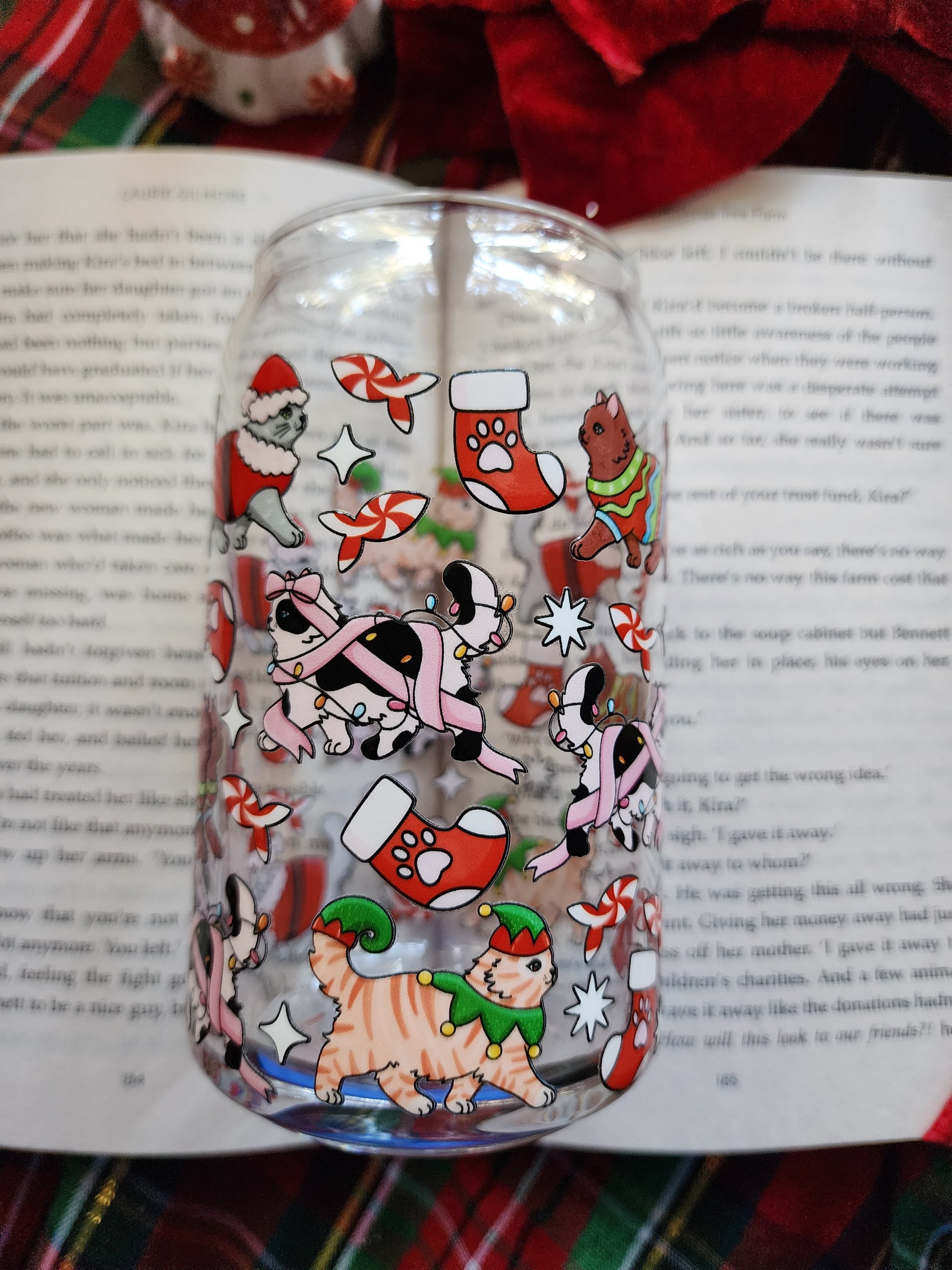 Christmas Cats 16oz glass can| Winter| Christmas| Cute Glass Can|Glass Tumbler w/Straw & Lid|